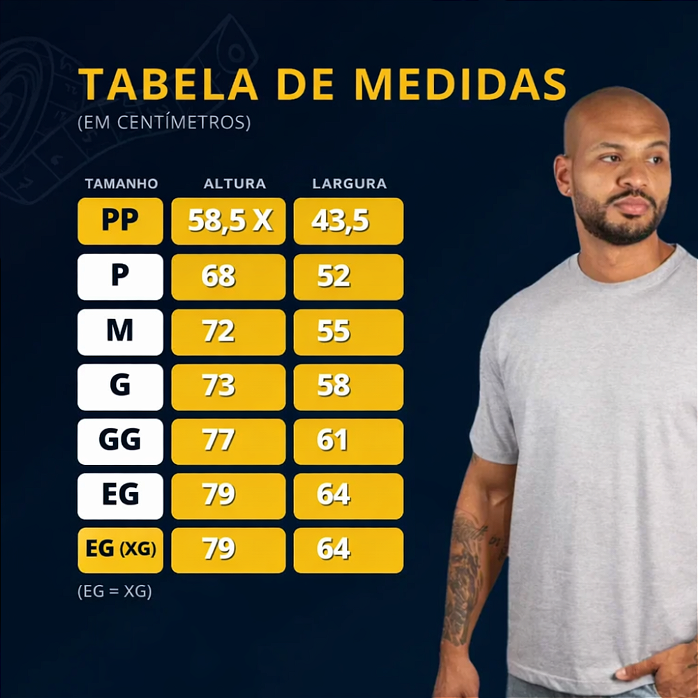 Por isso, recomendamos medir uma camiseta que você já usa e comparar com nossa tabela antes de comprar.
