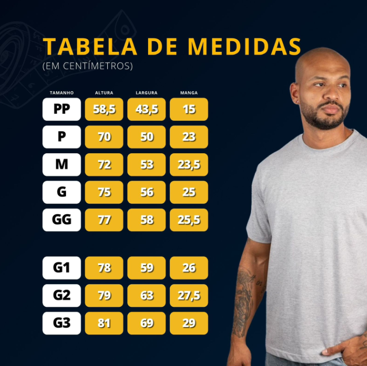 Por isso, recomendamos medir uma camiseta que você já usa e comparar com nossa tabela antes de comprar.